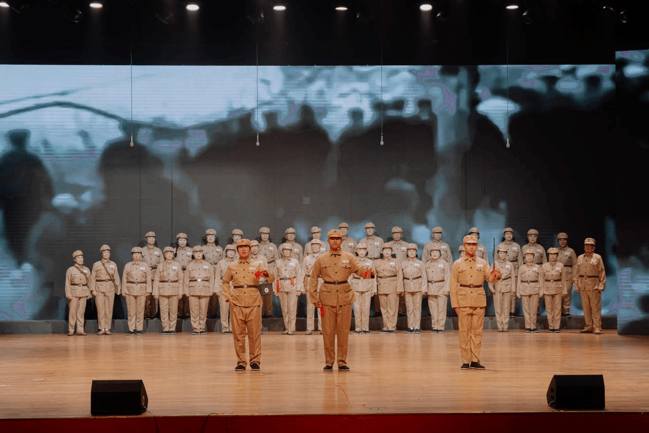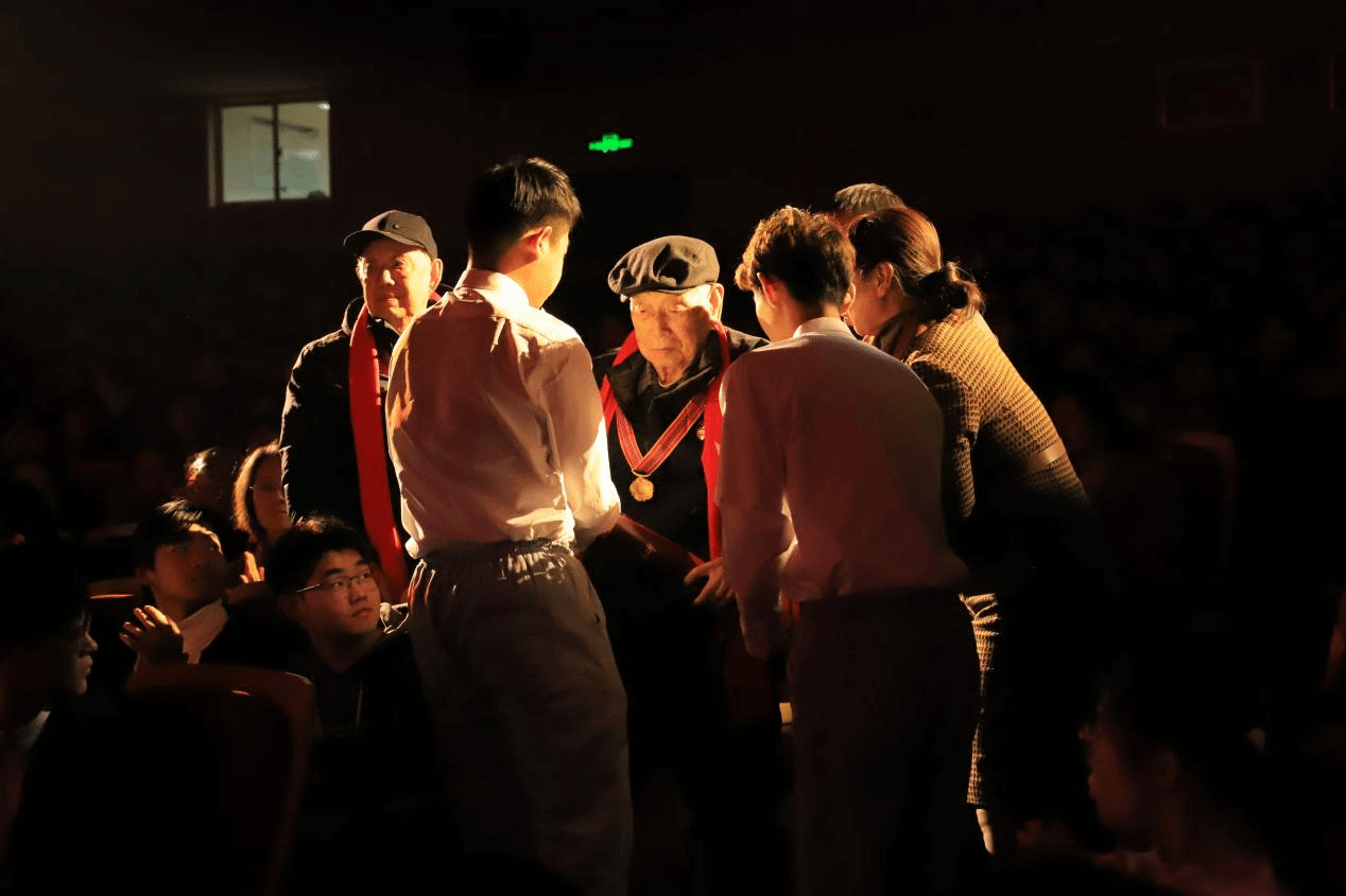 终幕“精神永恒”环节,现场氛围达到高潮——学生代表缓缓走向观众席,为申光宪、李梅春两位老兵敬献鲜花。申光宪曾于1951年至1953年赴朝作战,战后在轧钢领域深耕科研,两次留学日本,并于75岁高龄获东京大学工学博士学位,用“枪杆+算尺”生动诠释了家国情怀。李梅春则以“白衣为甲”,延续着守护生命的初心。鲜花映着老兵的笑颜,也映照着红色精神代代相传的初心,将红色精神永放光芒的信念深深镌刻在每一位观众心中。
