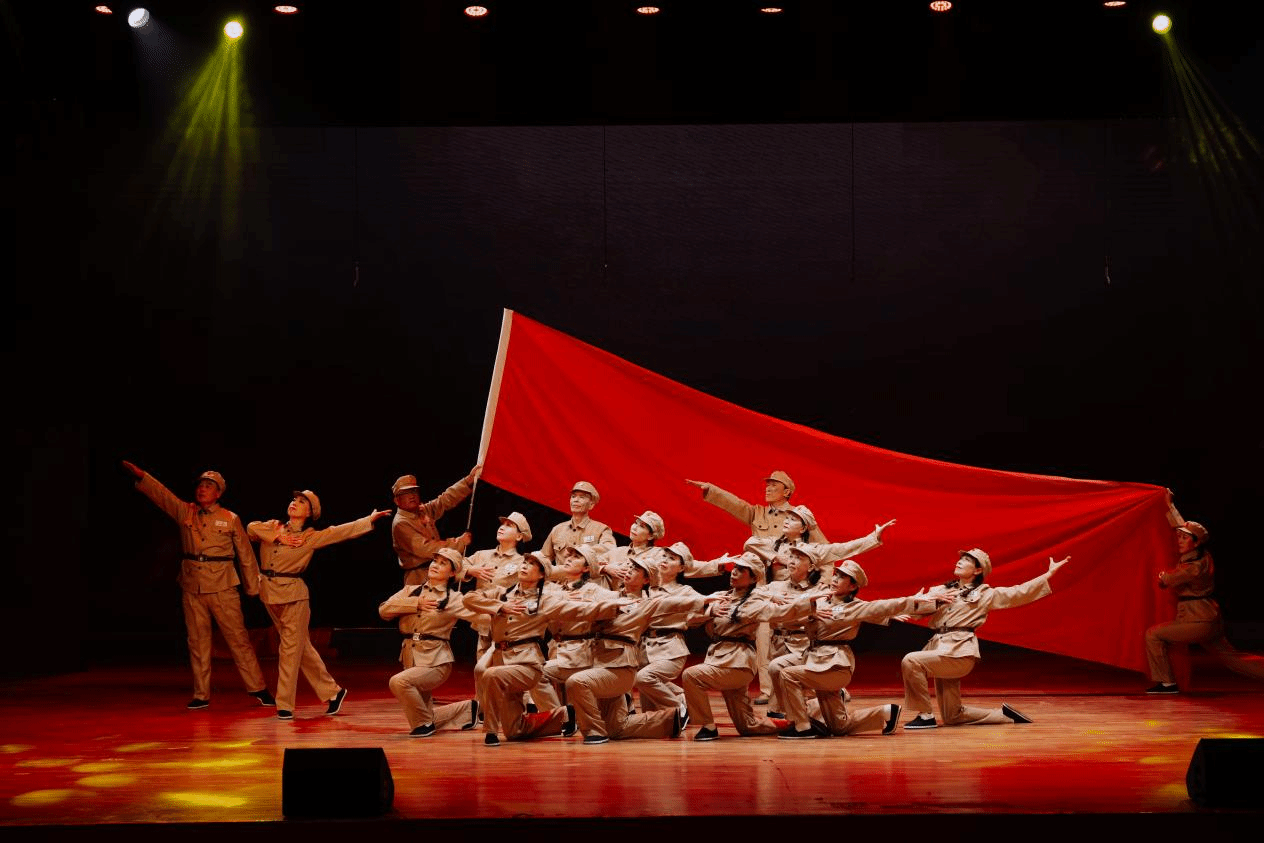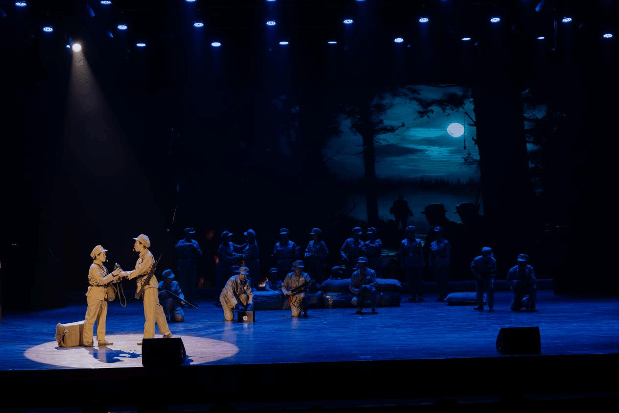 整场演出以抗美援朝历史为主线,分为六个篇章,艺术化再现了那段峥嵘岁月。序幕“黎明曙光”以民族舞蹈生动呈现新中国成立初期各族人民欢庆团结的动人画面。“保家卫国”篇章通过情景演绎,真实展现志愿军行军的艰苦环境与云山夜战的英勇瞬间。“冰火忠魂”篇章聚焦长津湖战役中“冰雕连”的坚守壮举,彰显深沉的家国情怀。“山河同庆”篇章演绎了中朝人民共庆胜利的温情场景。“薪火永传”篇章通过老兵与青年学生的跨时空对话,搭建起精神传承的桥梁。