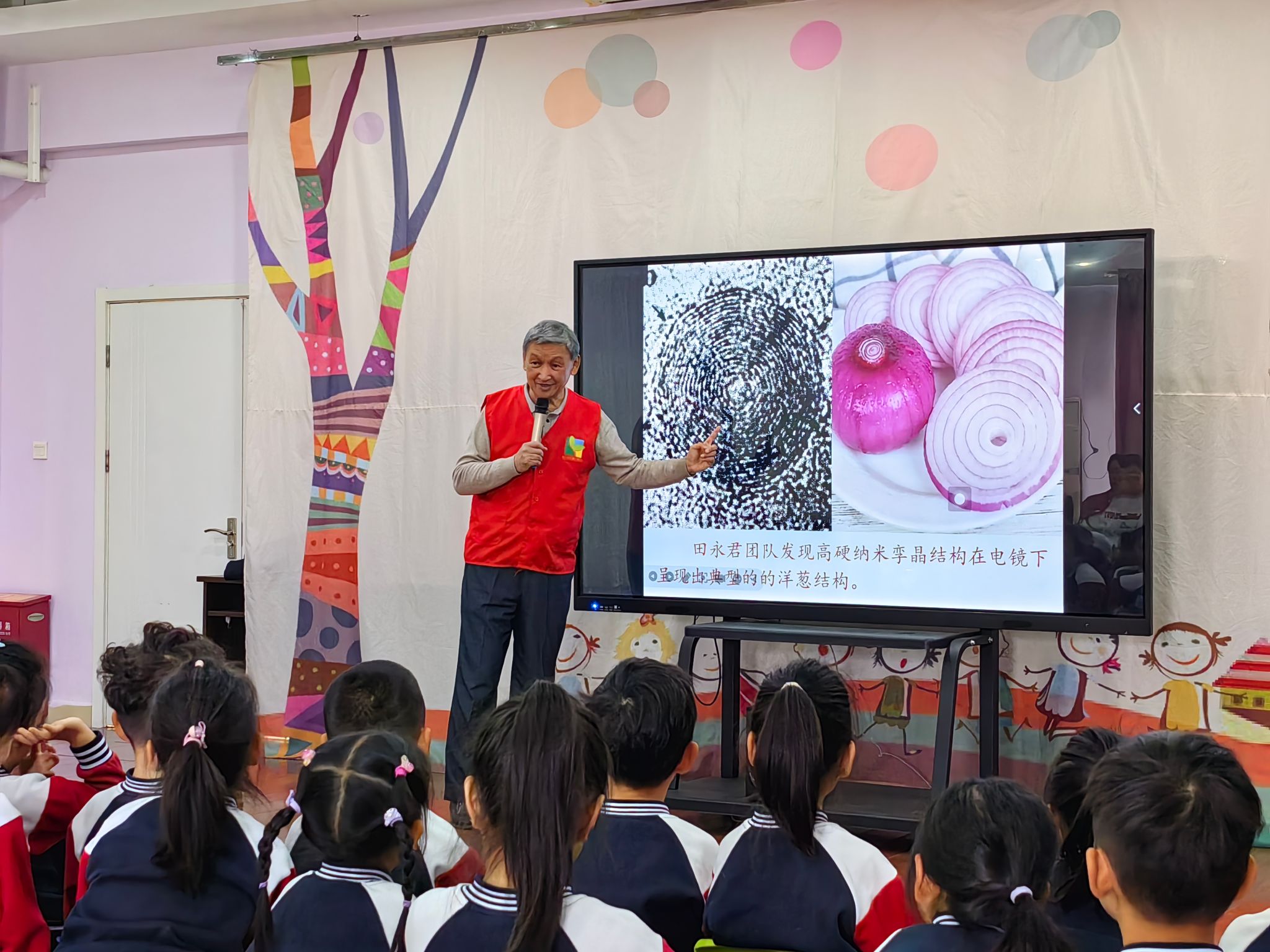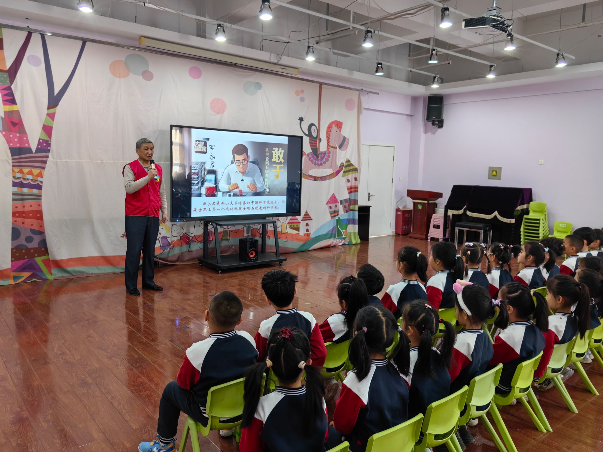 活动中,“五老”代表向幼儿园赠送以读书月为主题的书法作品。作品笔力遒劲、神韵俱佳,不仅展现出老教授深厚的书法功底,更寄托着老一辈对孩子们的殷切期望与美好祝福。老党员白靖老师走进课堂,为孩子们讲述燕山大学田永君院士的故事。从婉拒德国教授挽留毅然归国,到凭借坚韧毅力攻克科技难题,白老师用生动语言与鲜活事例,勾勒出田院士专注科研的身影。孩子们听得全神贯注,不时发出赞叹,幼小的心灵深受触动。