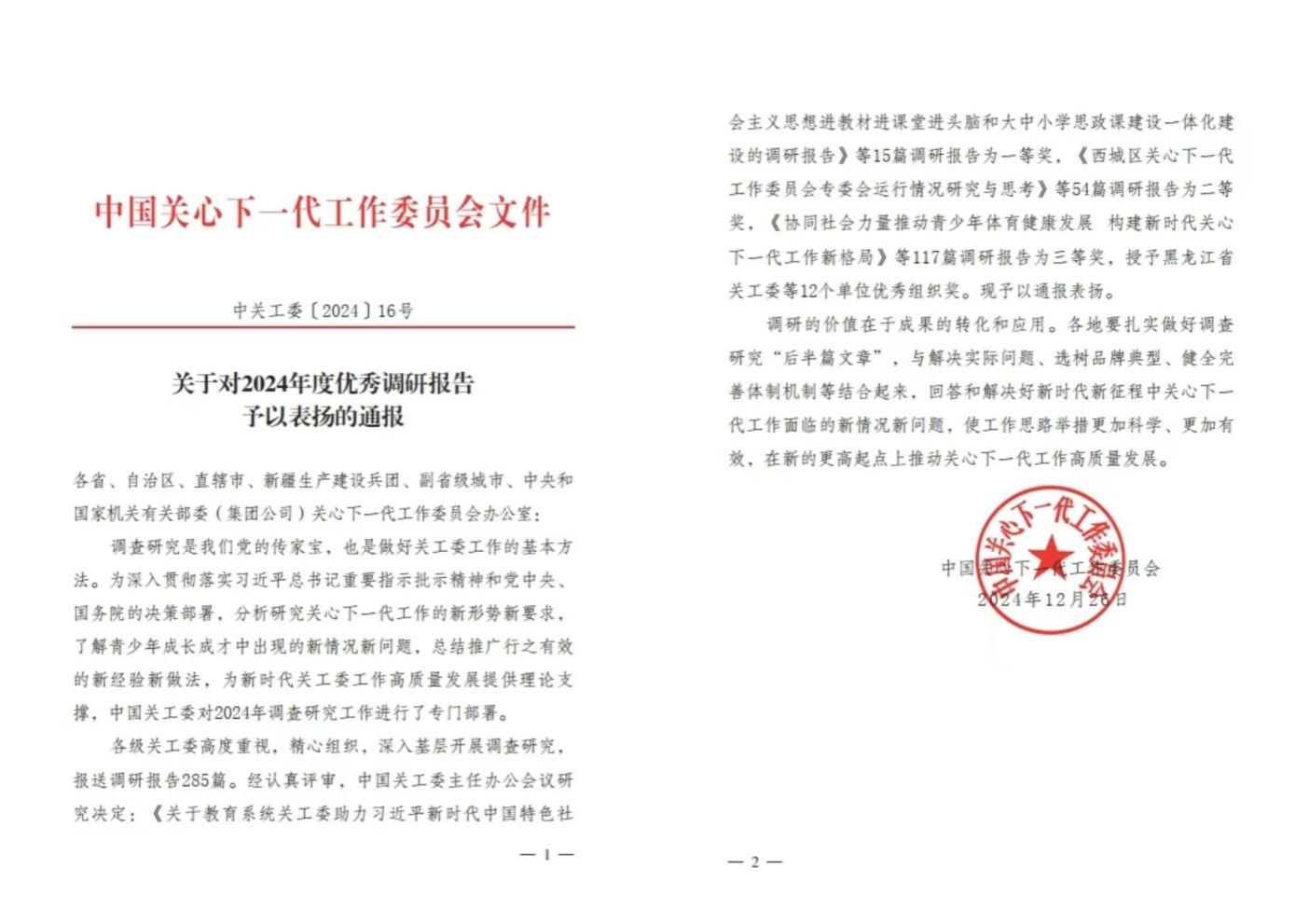 调查研究是做好关心下一代工作的基本方法,2024年以来,中国关工委部署开展全国范围内的调查研究工作,各级关工委积极响应、精心组织,共报送调研报告285篇。经严格评审和主任办公会议研究,最终评选出一等奖15篇、二等奖54篇、三等奖117篇及优秀组织奖12个。燕山大学关工委深耕青年大学生思想道德建设领域,依托学校教育资源与“五老”优势,聚焦“读懂中国”活动开展深入调研,系统总结活动中的创新做法与实践成效,为高校培育具有“四个自信”的时代新人提供了有益借鉴。