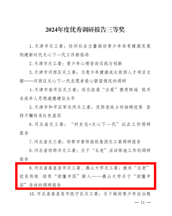 2025年1月,中国关心下一代工作委员会发布《关于对2024年度优秀调研报告予以表扬的通报》,由燕山大学关工委与河北省秦皇岛市关工委联合撰写的《继承“五老”优良传统 培育“读懂中国”新人——燕山大学关于“读懂中国”活动的调研报告》荣获三等奖,是此次全国获奖单位中仅有的三所高校之一。