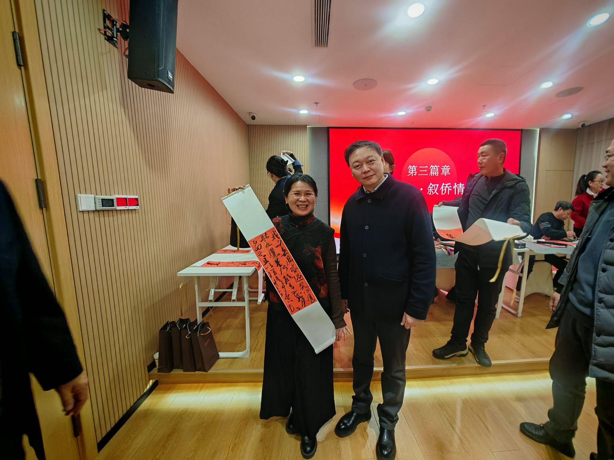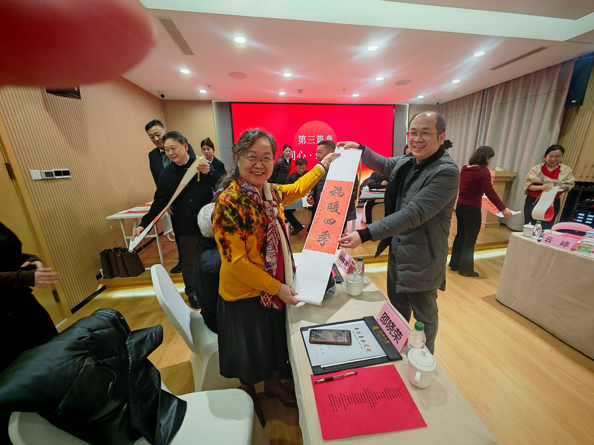 活动现场还特别邀请了秦皇岛市书法家协会的书画家们挥毫泼墨,以笔为媒、以墨传情,将侨联七十年的光辉历程、归侨侨眷的赤子情怀融入笔墨之中,一幅幅主题鲜明、气韵流畅的书画作品跃然纸上,既歌颂祖国繁荣昌盛,也抒发侨心向党赤诚,现场墨香氤氲、暖意融融。我校老同志代表们在书画创作环节与书画家们亲切交流,共赏笔墨丹青,共话侨界情谊,在传统文化的浸润中感受侨界大家庭的温暖,进一步凝聚了奋进力量。